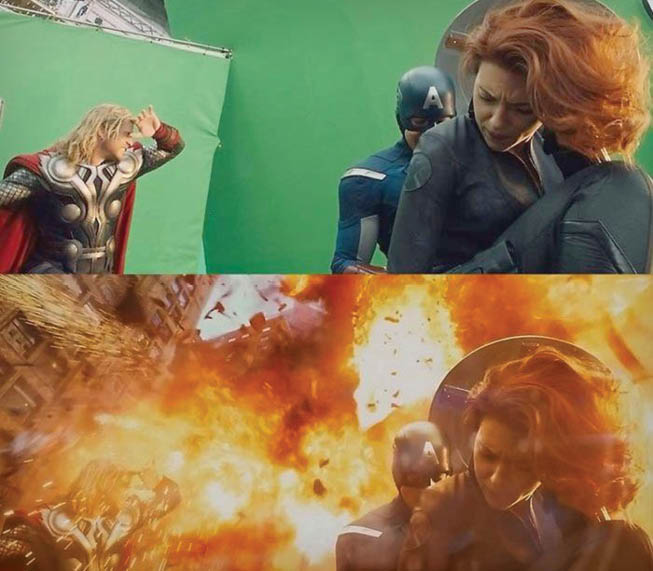 برای فیلمهای علمی و تخیلی، انتخاب لوکیشن دلخواه بسیار دشوار است. به همین دلیل بسیاری از لوکیشنها در یک فضای ساده سبز رنگ ضبط میشوند و سپس به کمک تکنیکهای رایانه ای جابهجایی صورت میگیرد. تکنیک کورما کِی، یکی از اساسیترین تکنیکها در جلوههای ویژه است. در این تکنیک اشخاص در فضای بستهای که با پرده یا دیوارهای سبز پوشانده شدهاند، قرار میگیرند. بعد از ضبط هر سکانس، متخصصان جلوههای ویژه، پرده سبز را حذف و تصاویر دلخواه را اضافه میکنند. شرایط آب و هوایی ، افکتهای تصویری ومیزان نور، همگی لایه به لایه روی تصویر پایه مینشینند. سکانسهای انفجار در مناطقی خارج از شهر ضبط میشوند. در این شرایط مسیر انفجار، سقوط یا هر نوع خرابی دیگر با دیوارهای متحرک، روباز و سراسر سبز پوشانده میشوند؛ همچنین برای این کار، فضاهای قابل حمل که شبیه کارتن باز و بسته میشود، وجود دارند. تا چند سال گذشته که پرده سبز کمتر استفاده می شد، برای نمایش موقعیتها و طبیعت اطراف، از پوسترهای غولآسا استفاده میکردند. بیشتر فیلمهای ژانر اکشن، فانتزی، علمی و تخیلی در اتاقهای سبز ضبط میشوند چراکه هر قدر هم پروژه گستردهتر شود، دست عوامل برای استفاده از منابع بازتر خواهد بود. به عنوان مثال یک فیلم با بودجه کمتر به اجبار از خرابی کمتری استفاده میکند یا از فضاهای بسته، امن و کوچکتر بهره میگیرد اما در پروژههای بزرگ مثل «انتقام جویان»، سکانسهای مبارزه در فضاهای باز، وسیع و با ویرانی بیشتر تولید میشود.